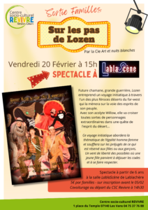 Spectacle en familles par Accueil CSC Revivre · 15 janvier 2026 Un spectacle en famille à LablaScène ça vous dit?Inscrivez vous vite !Tarif avantageux et organisation de covoiturage au départ des Vans..